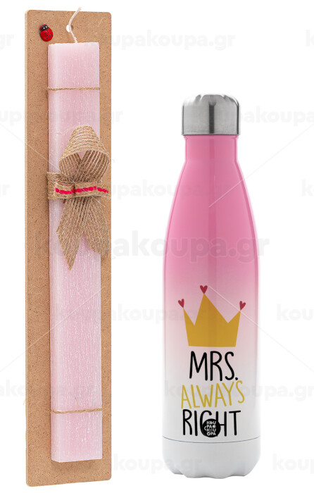 Mrs "Always" right, Easter Set, Metallic pink/white (Stainless steel) thermos, double-walled, 500ml & aromatic flat Easter candle (30cm) (PINK)