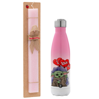 Yoda, i love you, Easter Set, Metallic pink/white (Stainless steel) thermos, double-walled, 500ml & aromatic flat Easter candle (30cm) (PINK)