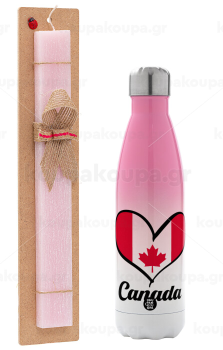 Canada flag, Easter Set, Metallic pink/white (Stainless steel) thermos, double-walled, 500ml & aromatic flat Easter candle (30cm) (PINK)