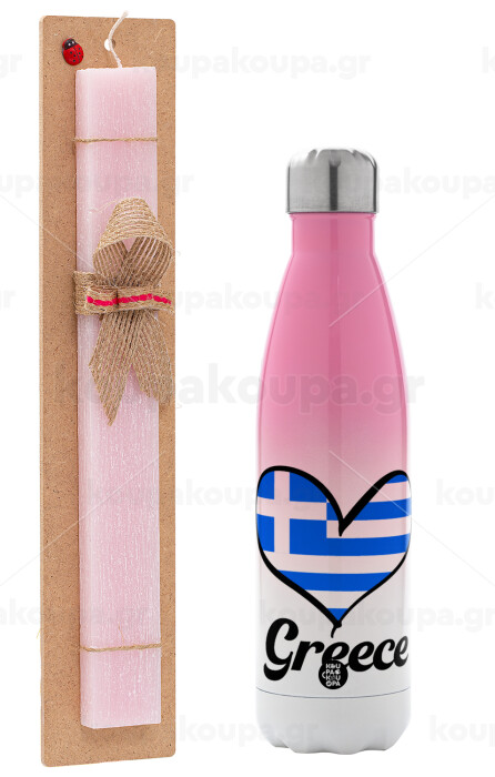 Greece flag, Easter Set, Metallic pink/white (Stainless steel) thermos, double-walled, 500ml & aromatic flat Easter candle (30cm) (PINK)