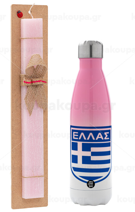Hellas, Easter Set, Metallic pink/white (Stainless steel) thermos, double-walled, 500ml & aromatic flat Easter candle (30cm) (PINK)