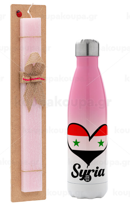 Syria flag, Easter Set, Metallic pink/white (Stainless steel) thermos, double-walled, 500ml & aromatic flat Easter candle (30cm) (PINK)