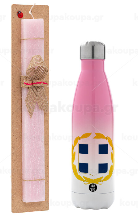 Hellas Εθνόσημο, Easter Set, Metallic pink/white (Stainless steel) thermos, double-walled, 500ml & aromatic flat Easter candle (30cm) (PINK)