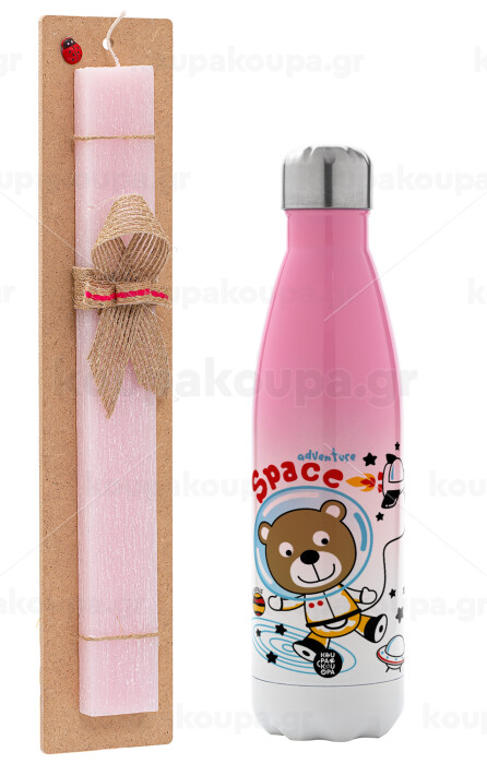 Kids Space, Easter Set, Metallic pink/white (Stainless steel) thermos, double-walled, 500ml & aromatic flat Easter candle (30cm) (PINK)
