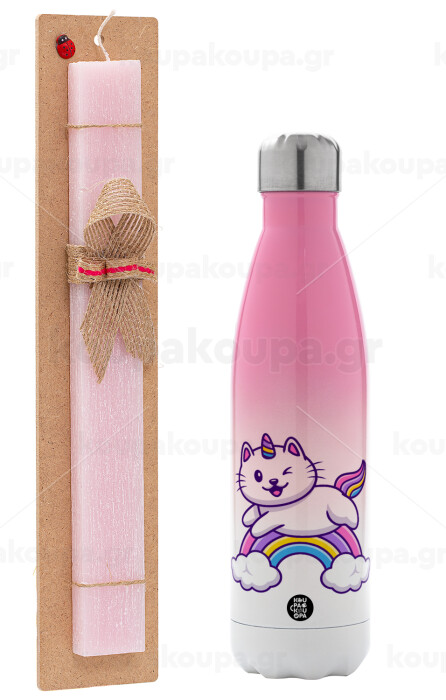 Cute cat unicorn, Easter Set, Metallic pink/white (Stainless steel) thermos, double-walled, 500ml & aromatic flat Easter candle (30cm) (PINK)