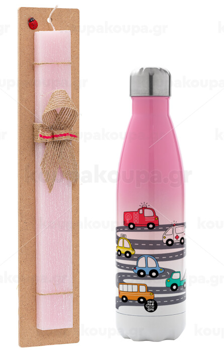 Hand drawn childish set with cars, Easter Set, Metallic pink/white (Stainless steel) thermos, double-walled, 500ml & aromatic flat Easter candle (30cm) (PINK)