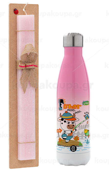 Kids Fisherman, Easter Set, Metallic pink/white (Stainless steel) thermos, double-walled, 500ml & aromatic flat Easter candle (30cm) (PINK)