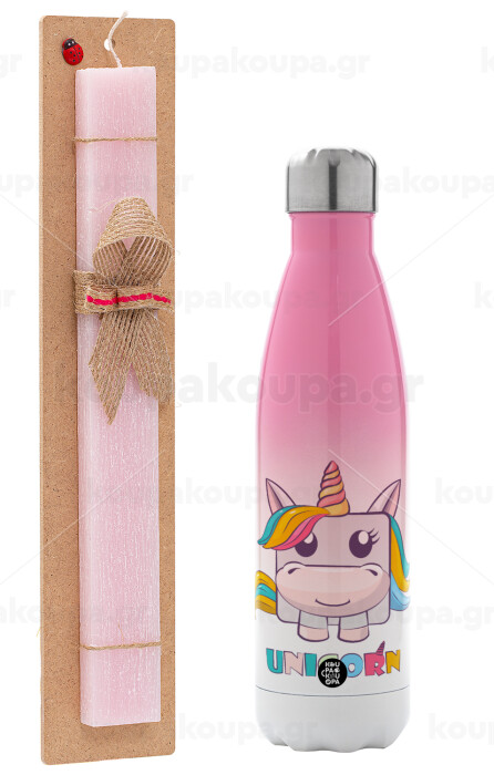 Unicorns cube, Easter Set, Metallic pink/white (Stainless steel) thermos, double-walled, 500ml & aromatic flat Easter candle (30cm) (PINK)