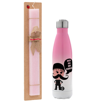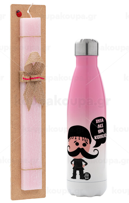 Κρητικός "Ίντα λες ωρέ κοπέλι", Easter Set, Metallic pink/white (Stainless steel) thermos, double-walled, 500ml & aromatic flat Easter candle (30cm) (PINK)