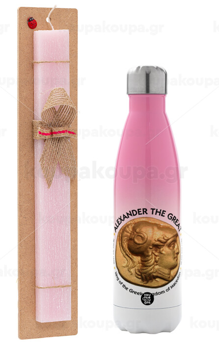 Alexander the Great, Easter Set, Metallic pink/white (Stainless steel) thermos, double-walled, 500ml & aromatic flat Easter candle (30cm) (PINK)