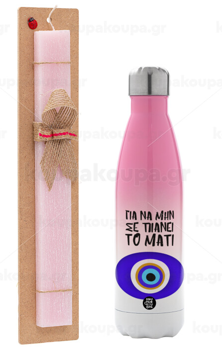 Για να μην σε πιάνει το μάτι, Easter Set, Metallic pink/white (Stainless steel) thermos, double-walled, 500ml & aromatic flat Easter candle (30cm) (PINK)