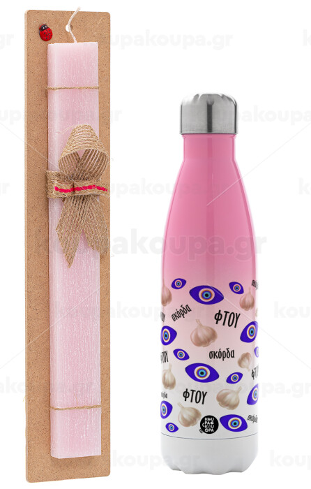 Φτου, φτου, σκόρδα!!!, Easter Set, Metallic pink/white (Stainless steel) thermos, double-walled, 500ml & aromatic flat Easter candle (30cm) (PINK)