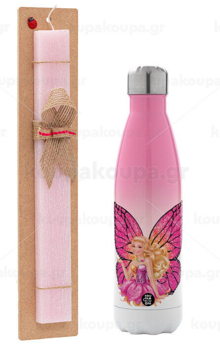 A fairy Barbie, Easter Set, Metallic pink/white (Stainless steel) thermos, double-walled, 500ml & aromatic flat Easter candle (30cm) (PINK)
