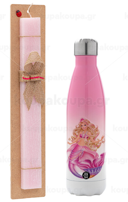 Barbie mermaid blue, Easter Set, Metallic pink/white (Stainless steel) thermos, double-walled, 500ml & aromatic flat Easter candle (30cm) (PINK)