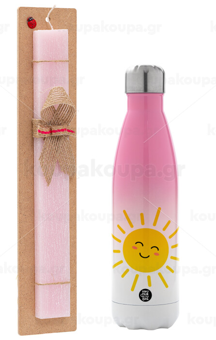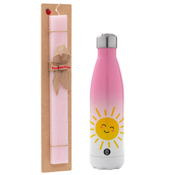 Happy sun, Easter Set, Metallic pink/white (Stainless steel) thermos, double-walled, 500ml & aromatic flat Easter candle (30cm) (PINK)