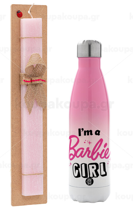 I'm Barbie girl, Easter Set, Metallic pink/white (Stainless steel) thermos, double-walled, 500ml & aromatic flat Easter candle (30cm) (PINK)