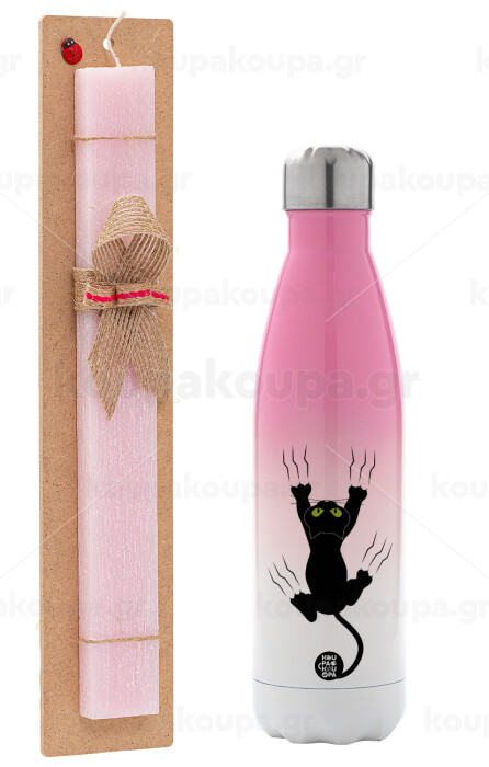 cat grabbing, Easter Set, Metallic pink/white (Stainless steel) thermos, double-walled, 500ml & aromatic flat Easter candle (30cm) (PINK)