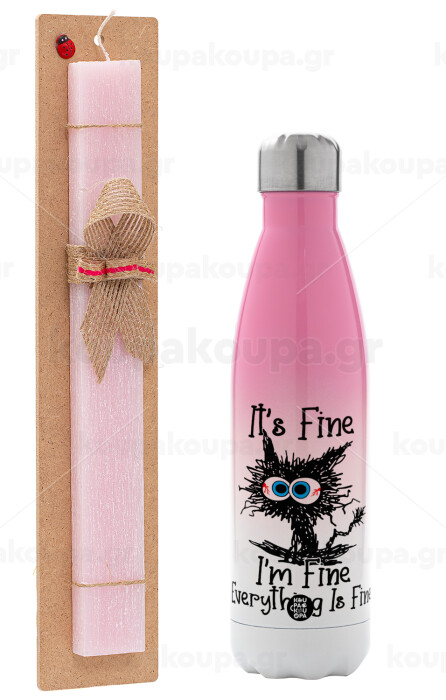 Cat, It's Fine I'm Fine Everything Is Fine, Easter Set, Metallic pink/white (Stainless steel) thermos, double-walled, 500ml & aromatic flat Easter candle (30cm) (PINK)