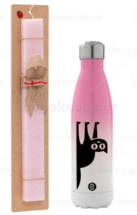 Cat upside down, Easter Set, Metallic pink/white (Stainless steel) thermos, double-walled, 500ml & aromatic flat Easter candle (30cm) (PINK)