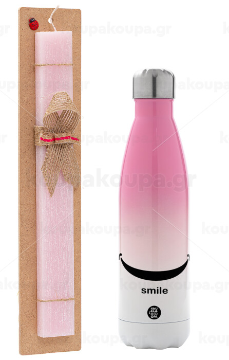 Smile!!!, Easter Set, Metallic pink/white (Stainless steel) thermos, double-walled, 500ml & aromatic flat Easter candle (30cm) (PINK)
