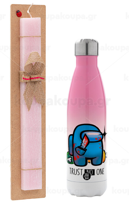 Among Trust no one, Easter Set, Metallic pink/white (Stainless steel) thermos, double-walled, 500ml & aromatic flat Easter candle (30cm) (PINK)