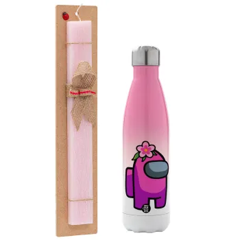 Among US girl, Easter Set, Metallic pink/white (Stainless steel) thermos, double-walled, 500ml & aromatic flat Easter candle (30cm) (PINK)