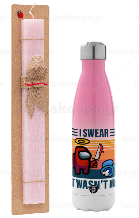 Among us, I swear it wasn't me, Easter Set, Metallic pink/white (Stainless steel) thermos, double-walled, 500ml & aromatic flat Easter candle (30cm) (PINK)
