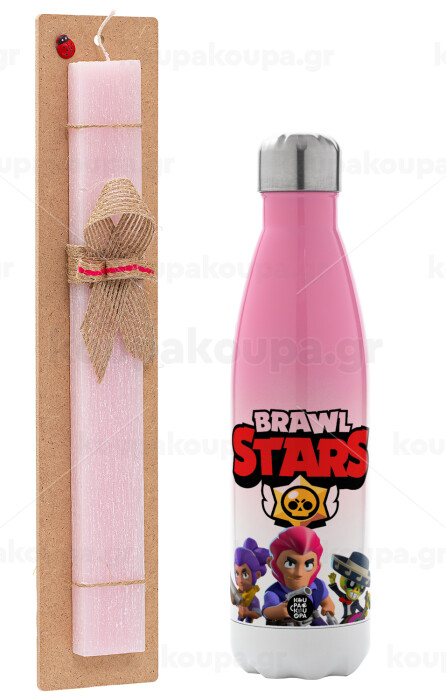 Brawl Stars Blue, Easter Set, Metallic pink/white (Stainless steel) thermos, double-walled, 500ml & aromatic flat Easter candle (30cm) (PINK)