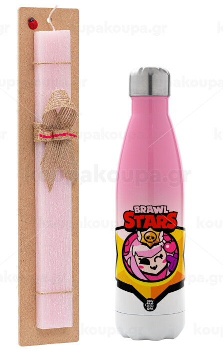 Brawl Stars Melodie, Easter Set, Metallic pink/white (Stainless steel) thermos, double-walled, 500ml & aromatic flat Easter candle (30cm) (PINK)
