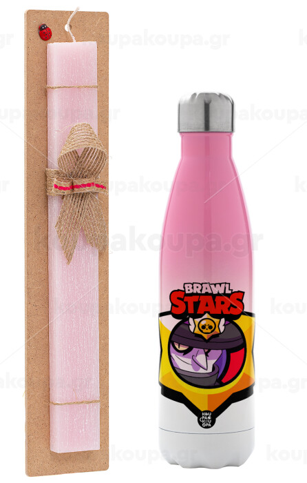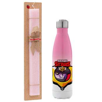 Brawl Stars Mortis, Easter Set, Metallic pink/white (Stainless steel) thermos, double-walled, 500ml & aromatic flat Easter candle (30cm) (PINK)