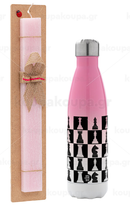 Chess set, Easter Set, Metallic pink/white (Stainless steel) thermos, double-walled, 500ml & aromatic flat Easter candle (30cm) (PINK)