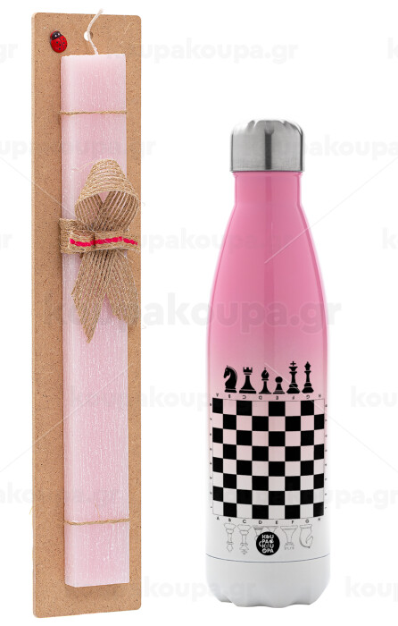 Chess, Easter Set, Metallic pink/white (Stainless steel) thermos, double-walled, 500ml & aromatic flat Easter candle (30cm) (PINK)