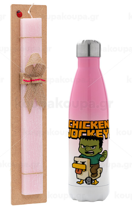 Chicken Jockey, Easter Set, Metallic pink/white (Stainless steel) thermos, double-walled, 500ml & aromatic flat Easter candle (30cm) (PINK)