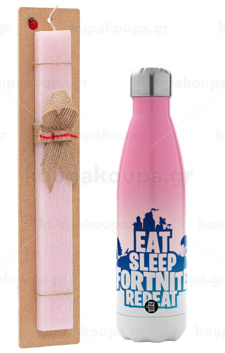 Eat Sleep Fortnite Repeat, Easter Set, Metallic pink/white (Stainless steel) thermos, double-walled, 500ml & aromatic flat Easter candle (30cm) (PINK)