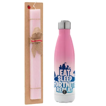 Eat Sleep Fortnite Repeat, Easter Set, Metallic pink/white (Stainless steel) thermos, double-walled, 500ml & aromatic flat Easter candle (30cm) (PINK)