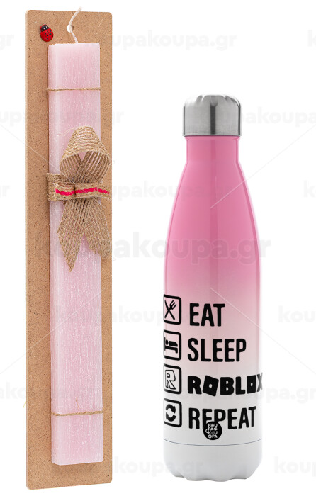 Eat, Sleep, Roblox, Repeat, Easter Set, Metallic pink/white (Stainless steel) thermos, double-walled, 500ml & aromatic flat Easter candle (30cm) (PINK)