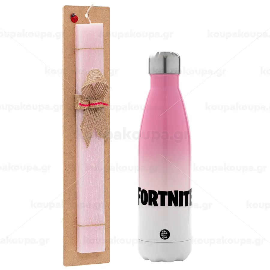 Fortnite landscape, Easter Set, Metallic pink/white (Stainless steel) thermos, double-walled, 500ml & aromatic flat Easter candle (30cm) (PINK)