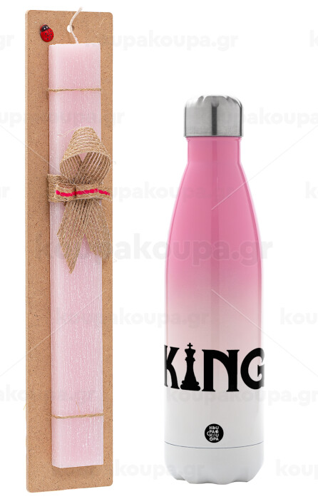 King chess, Easter Set, Metallic pink/white (Stainless steel) thermos, double-walled, 500ml & aromatic flat Easter candle (30cm) (PINK)