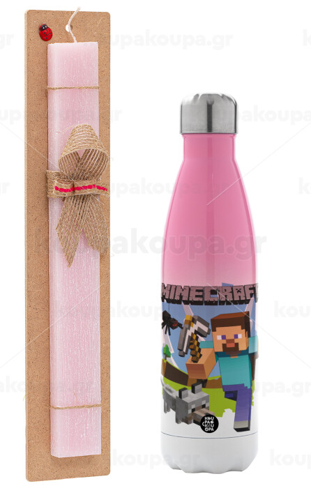 Minecraft Alex, Easter Set, Metallic pink/white (Stainless steel) thermos, double-walled, 500ml & aromatic flat Easter candle (30cm) (PINK)