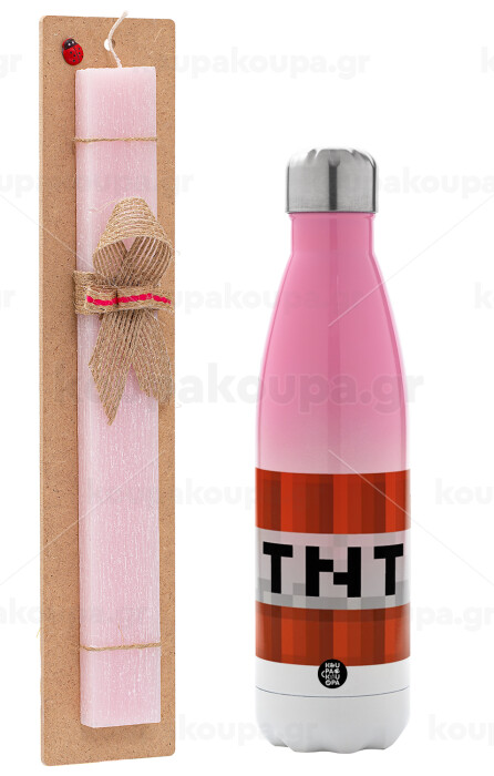 Minecraft TNT, Easter Set, Metallic pink/white (Stainless steel) thermos, double-walled, 500ml & aromatic flat Easter candle (30cm) (PINK)