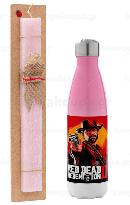 Red Dead Redemption 2, Easter Set, Metallic pink/white (Stainless steel) thermos, double-walled, 500ml & aromatic flat Easter candle (30cm) (PINK)