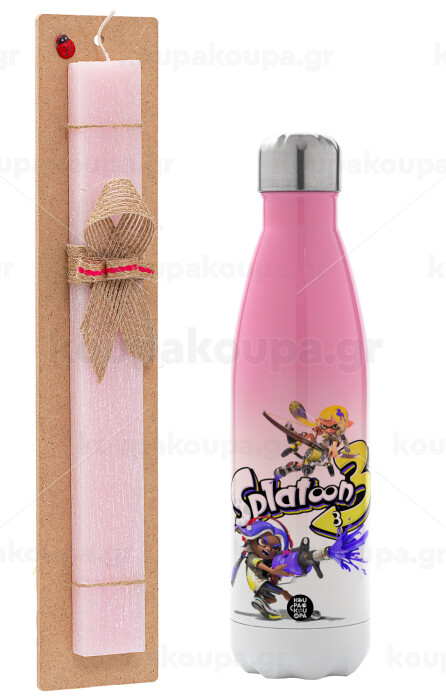 Splatoon 3, Easter Set, Metallic pink/white (Stainless steel) thermos, double-walled, 500ml & aromatic flat Easter candle (30cm) (PINK)