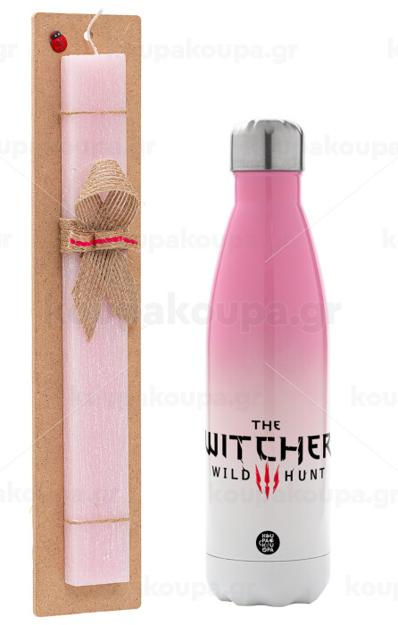 The witcher III wild hunt, Easter Set, Metallic pink/white (Stainless steel) thermos, double-walled, 500ml & aromatic flat Easter candle (30cm) (PINK)