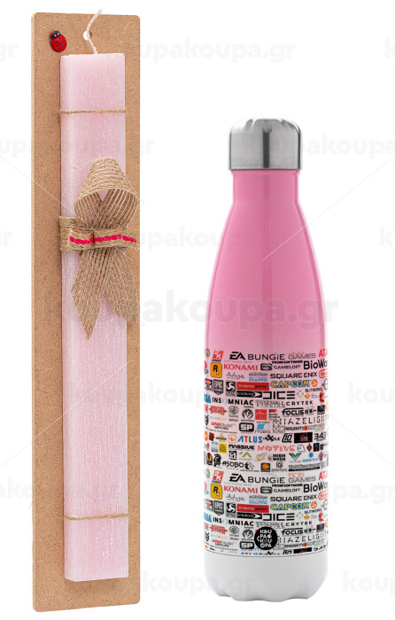 Video Game Studio Logos, Easter Set, Metallic pink/white (Stainless steel) thermos, double-walled, 500ml & aromatic flat Easter candle (30cm) (PINK)