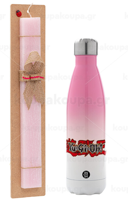 Yu-Gi-Oh, Easter Set, Metallic pink/white (Stainless steel) thermos, double-walled, 500ml & aromatic flat Easter candle (30cm) (PINK)