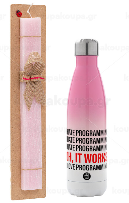 I hate programming!!!, Easter Set, Metallic pink/white (Stainless steel) thermos, double-walled, 500ml & aromatic flat Easter candle (30cm) (PINK)