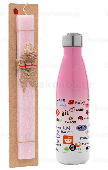 Tech logos, Easter Set, Metallic pink/white (Stainless steel) thermos, double-walled, 500ml & aromatic flat Easter candle (30cm) (PINK)