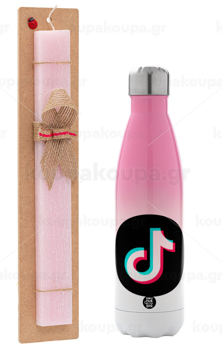 TikTok, Easter Set, Metallic pink/white (Stainless steel) thermos, double-walled, 500ml & aromatic flat Easter candle (30cm) (PINK)