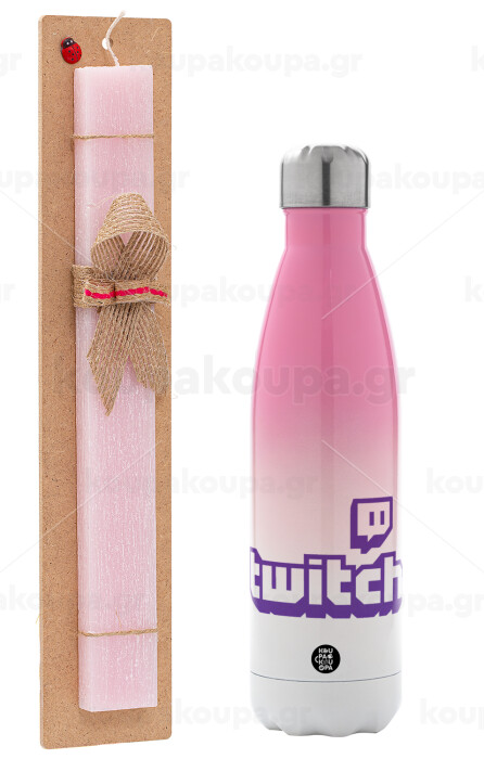 Twitch, Easter Set, Metallic pink/white (Stainless steel) thermos, double-walled, 500ml & aromatic flat Easter candle (30cm) (PINK)