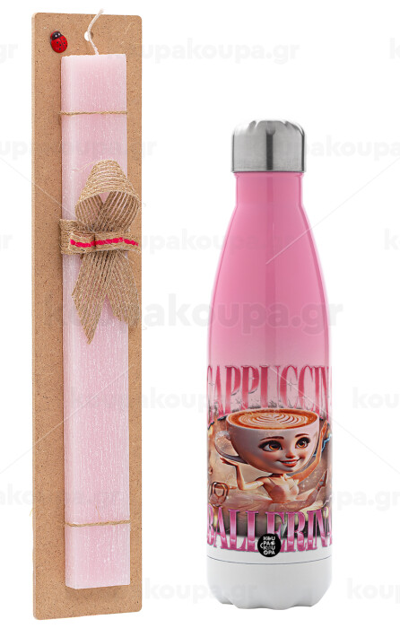 BALLERINA CAPUCHINA FUNK, Easter Set, Metallic pink/white (Stainless steel) thermos, double-walled, 500ml & aromatic flat Easter candle (30cm) (PINK)
